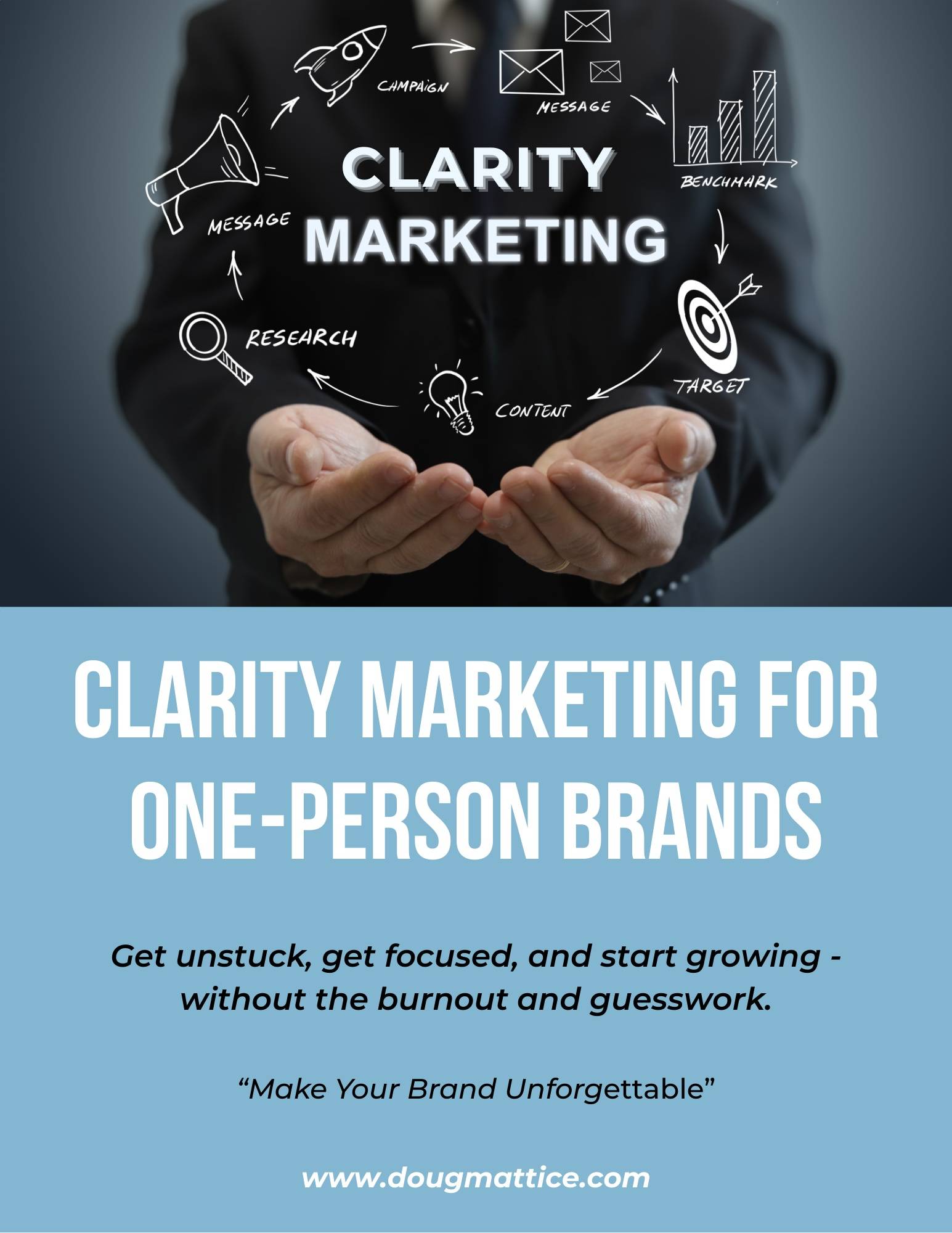 Grab your free copy of Clarity Marketing for One-Person Brands - the go-to guide for solopreneurs who want clear direction, consistent messaging, and confident marketing. Inside, you'll get the exact one-liner formula, website elements that convert 2X more visitors, and the 5-email sequence that nurtures leads into paying clients. No fluff, just results.